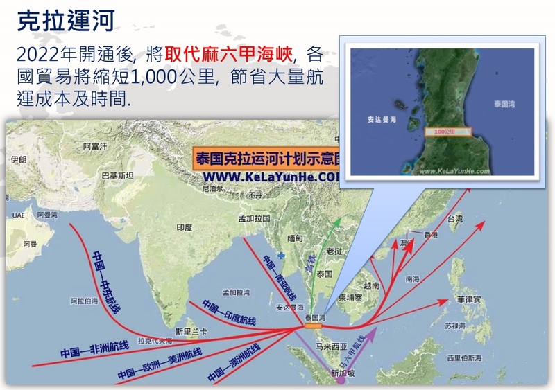 根據媒體報導,中國大陸三大工業集團最近打算在泰國南部興建貫穿暹羅灣與印度洋的「克拉運河」,這條長 100 公里的運河一旦完成,將成為亞洲最大的人工運河。